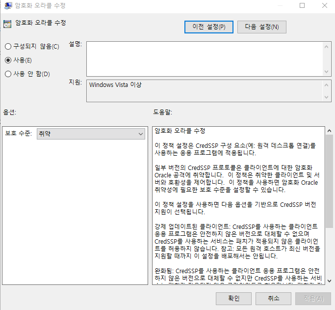 암호화 오라클 수정 -> 사용 -> 보호수준 [취약] 으로 변경